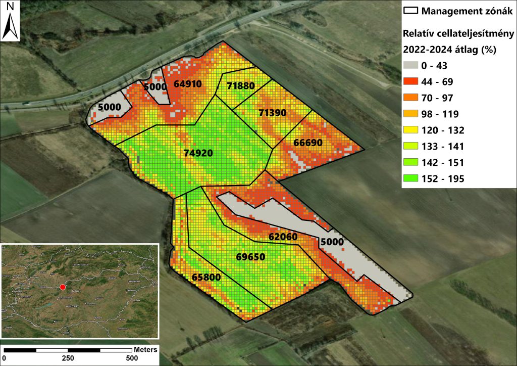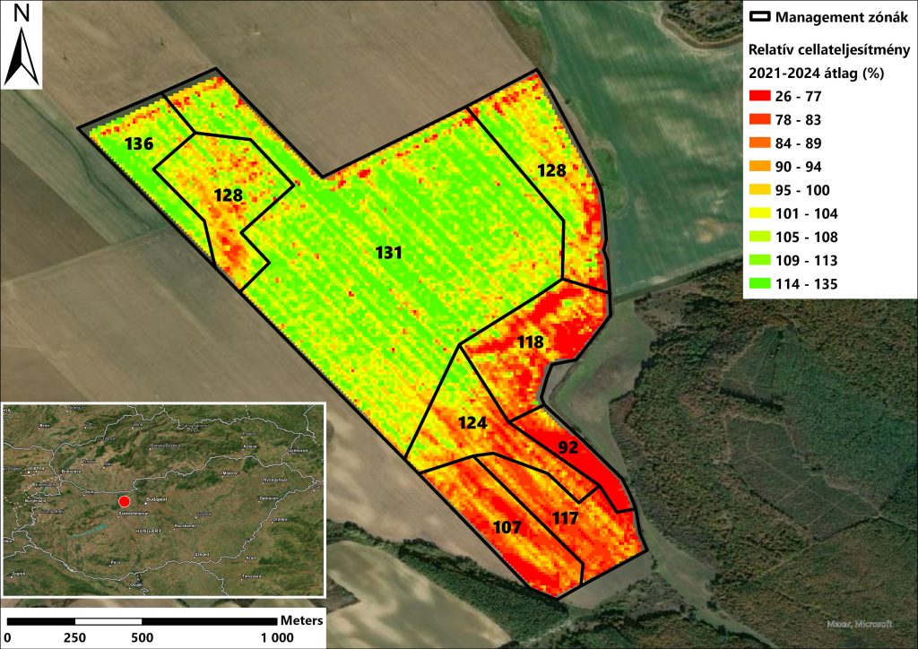 Az Esztergomban, a Duna közvetlen közelében fekvő táblában (46,3 ha) 2024-ben állítottuk be kukorica tőszámkísérletünket (DKC4109). A megvalósult differenciált vetés és a hozam visszaméréséből meghatároztuk a maximálisan és zónaszinten eltartható zónaszintű tőszámokat a következő kukorica vetéshez. 2022-ben egy dózisban 80.000 tőszámmal volt vetve a kukorica, melyet 2024-ben úgy optimalizáltunk, hogy 7 zsákkal kevesebb kellett. Méréseink szerint tehát ez a tábla nem tud eltartani 80.000-es tőszámot, hanem csak maximálisan közel 75.000-et, ráadásul csak a legjobban teljesítő zónájában. Azonban a szürke zónákban a kísérletünk által is bizonyított, terméketlen homokpadok találhatók, melyekben tőszámának extrém csökkentése indokolt, mivel AKG támogatás hiányában ezeket a területeket is művelésben kell tartani.