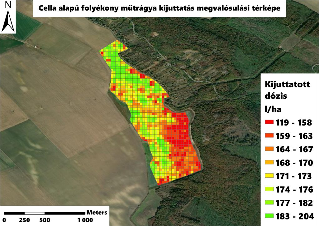 A tervezési előírás szerint 9348 liter Nitrosolt kívántunk kijuttatni. A visszamért, tisztított, interpolált adatok tekintetében összességében 9690 liter műtrágya kijuttatást detektáltunk. Ez 3,5% különbség, ami a fentiek fényében mérési hibán belüli érték.