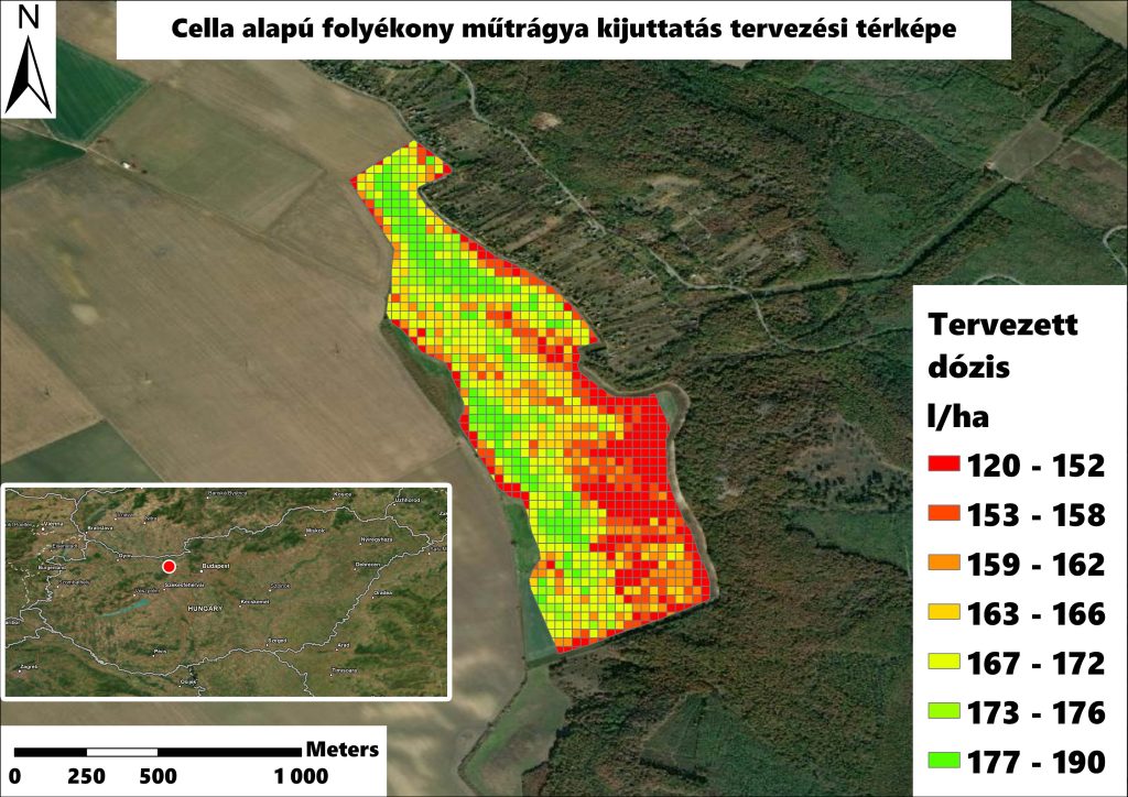 Kísérletünk színhelyéül egy 57 ha területű, dombsági táblát választottunk a Gerecsében, melyben őszi búza kultúra található. A műtrágya dózisolásakor a korábban alkalmazott üzemi összmennyiséget osztottuk el az egyes cellák hozamteljesítményének megfelelően. Ehhez mérten a táblaátlaghoz képest jobban teljesítő cellák több, a rosszabbul teljesítők kevesebb műtrágyát kaptak. Tehát összességében ugyanakkora mennyiségű műtrágya alkalmazása mellett magasabb termésátlag várható.