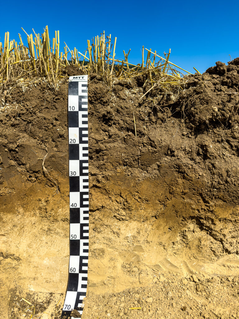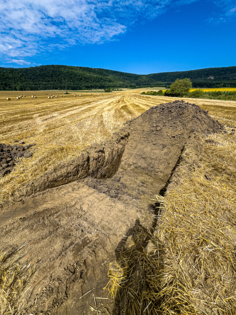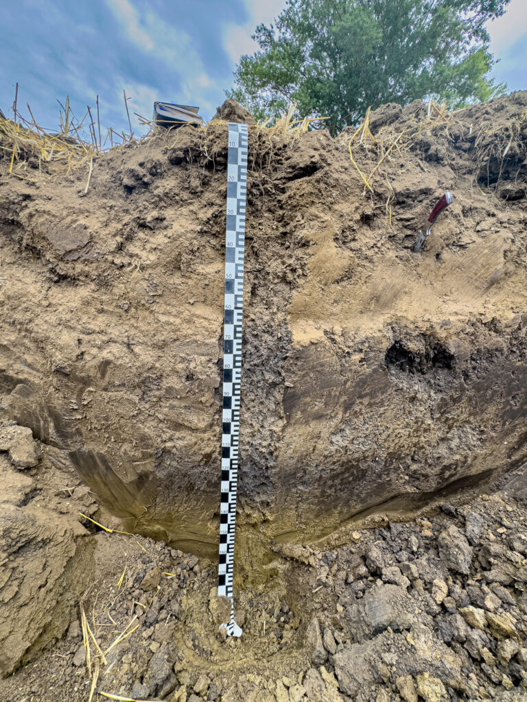 Egyes szorzótényezőkön belüli szorzótényezők megállapítására terepi méréseket is végeztünk. Illetve két talajszelvényt is nyitottunk, hogy lássátok az erózió brutális erejét és eddigi munkáját a táblában. A felhalmozódási zónában, tehát a tábla aljában nyitott szelvényünk brutális vastagságú áthalmozott B szintet tartalmaz.