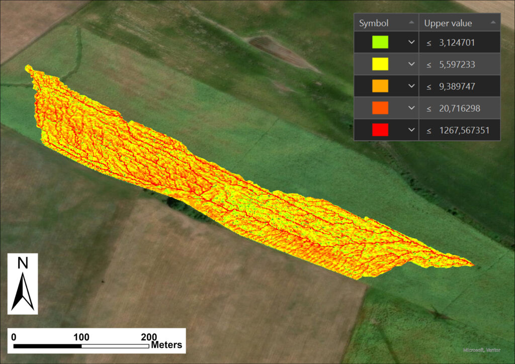- LS-faktor (Domborzat): Ez a legfontosabb. Ezzel már önmagában is lehet gyepsáv tervezést lefolytatni A drónos DEM (magasságtérkép) alapján minden egyes négyzetméterre kiszámoltuk az értékét. Itt jött ki igazán a domborzat brutális ereje, mert értéke LS=0-170 között változik. Ja és az automatizált adattisztító modellünket szabadítottuk rá a drónrepülésből kinyert adatokra is, így kizártuk a kiugró értékeket. Nem csak az egész adatsorból felfelé és lefelé kiugrókat, hanem az adatsorban lévő kiugró értékeket is.