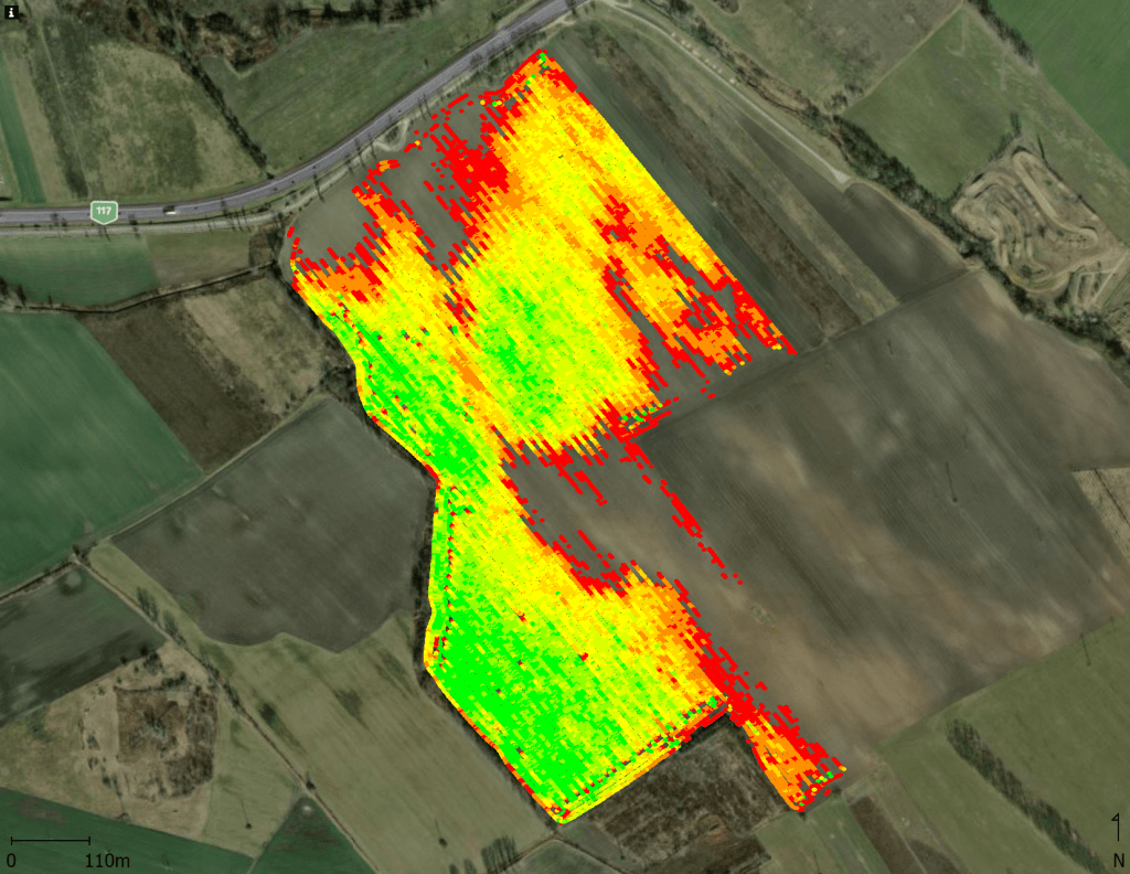 De ez működik fordítva is. Van, hogy úgy tűnik, nincs a táblában nagy lejtőszögű terület, a drón mégis pontosan megmutatja ezeket. Amikor repültük a virágzásban lévő napraforgó táblát, amiben gyepsávokat létesítettünk, akkor lehetett igazán érezni ezt a jelenséget. Alacsonyan repültünk a tábla felett és állandóan korrigálni kellett a magasságot, mert a tábla folyamatosan emelkedett, ami nem feltétlenül érzékelhető a terepen állva!