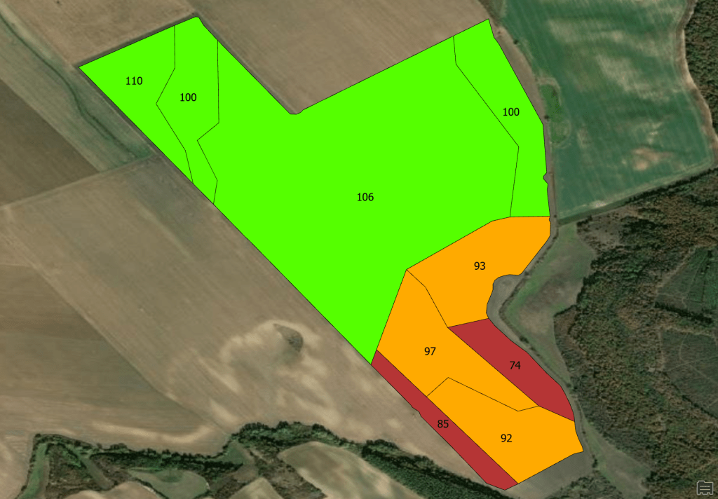 A Massey Ferguson Ideal hozammérős kombájn 2021-ben került beszerzésre, így azóta vannak mért hozamadataink a gazdaságból és így a vizsgált tábláról is. A zónákat így több évi (2021 repce, 2022 búza, 2023 repce) hozamokból határoztuk meg. Az adott évi relatív zónateljesítményeket 2021-2023 között kiátlagoltuk (a módszerről már olvashattál itt) és összevetettük az idei hozamok zónateljesítményeivel. Mivel minden év más és más termésminőséget és termésmennyiséget eredményez, ez jól meg fog mutatkozni a zónateljesítmények összehasonlításában. Emiatt hiba lenne csak erre alapozott mérést végezni, de ezt látni fogjátok az alábbiakban. Most nézzük mit mutatnak a relatív zónahozamok 4 év átlagában.