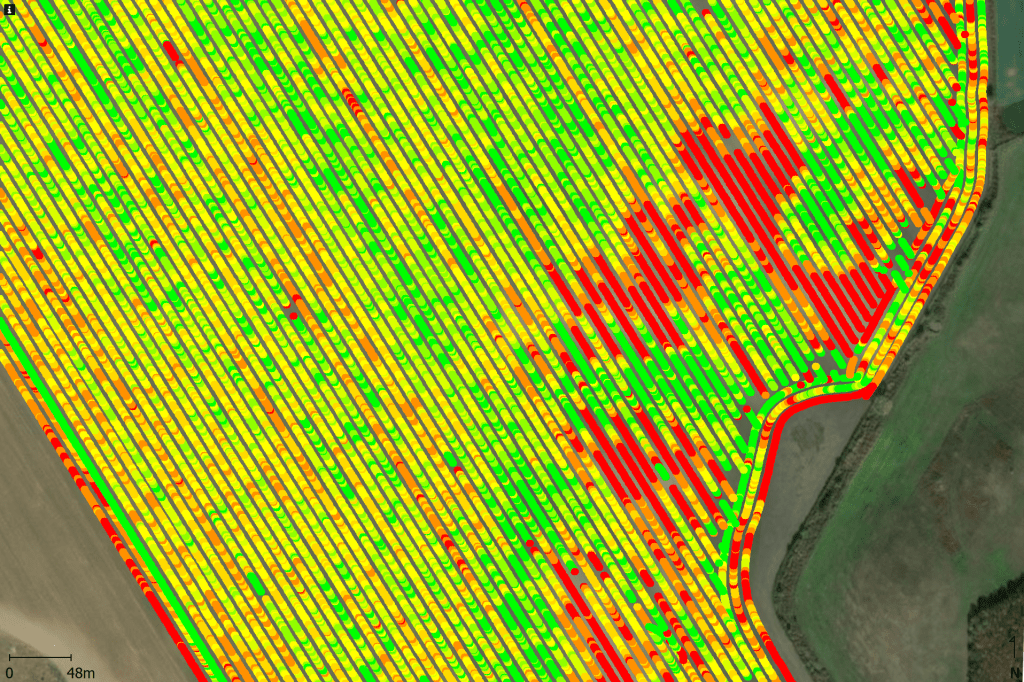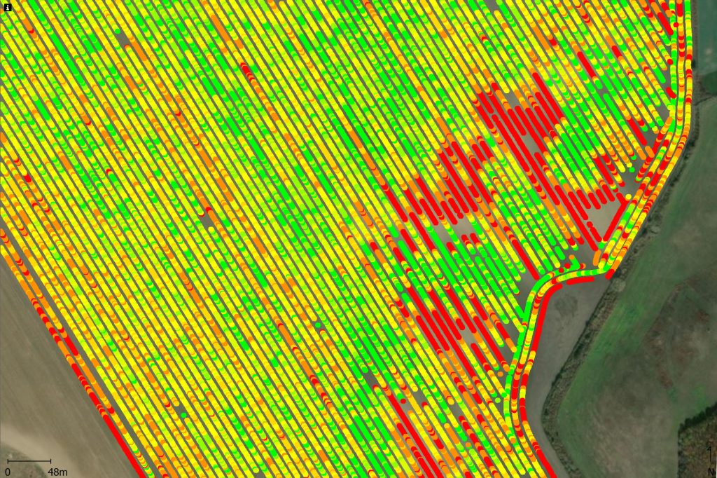 Itt már szembetűnőek a nyers adatokból származó hibák. A sorok végén a fordulókhoz érve hirtelen lecsökken vagy megnő az anyagáram, így a hozam, illetve dombélen áthaladáskor is kiugró értékek keletkeznek. Első ránézésre is látható, hogy ez így, ilyen formában nem használható fel kijuttatás-tervezéséhez. Ilyesmi jön ki az egyéb térinformatikai szoftverekből is, amiket aztán pdf formátumban szemügyre vehetsz és konstatálhatod, hogy hát igen, az a rész rossz, hiszen egy homokpad és az a rész persze, hogy jobb, ott csernozjom van. De ennyi, másra ilyen formában nem használható.