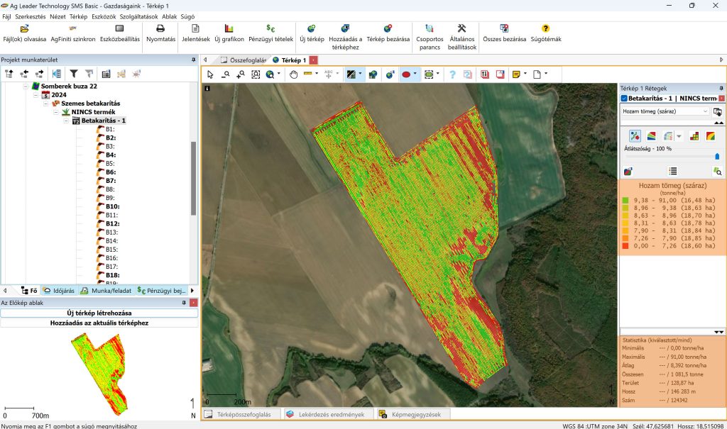 A jobb alsó sarokban az összesítésnél látható, hogy a tábla 2024-ben őszibúzából 1081,5 tonnát tudott. Nem egészen, mert nincsenek letisztázva az adatok. A mérlegen visszamért termény 1036 tonna volt. Ez ugyan 5%-on belüli hiba, de ennek értéke a rosszabb zónákban, jellemzően a lejtős, egyenetlen területrészeken felnagyítódik és nagyon elviszi a valódi zónateljesítmények értékeit. Emiatt nagyon fontos az adatok tisztítása, mert főként ezekre a területekre nem szükséges kijuttatni az üzemi átlag tápanyagot.