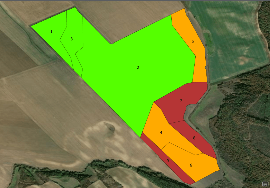 Megfigyelhető, különösen, ha összehasonlítjuk az idei hozamtérképpel, hogy a tábla É-i és középső területei a legjobbak. A közepétől D felé haladva érkezünk a gyengébb és rosszabb teljesítményű részekhez. Ezek azok a területek, amik közelebb fekszenek a domblábhoz, így igen változatos mikrodomborzati- és talajadottságok jellemzik. A D-i rész két piros sávjában 12-17% közötti lejtők találhatók váztalajon, ezért azok egyértelműen a leggyengébb teljesítményűek. A sok adat és színes ábra után nézzük, hogy fest a magasból ez a tábla.